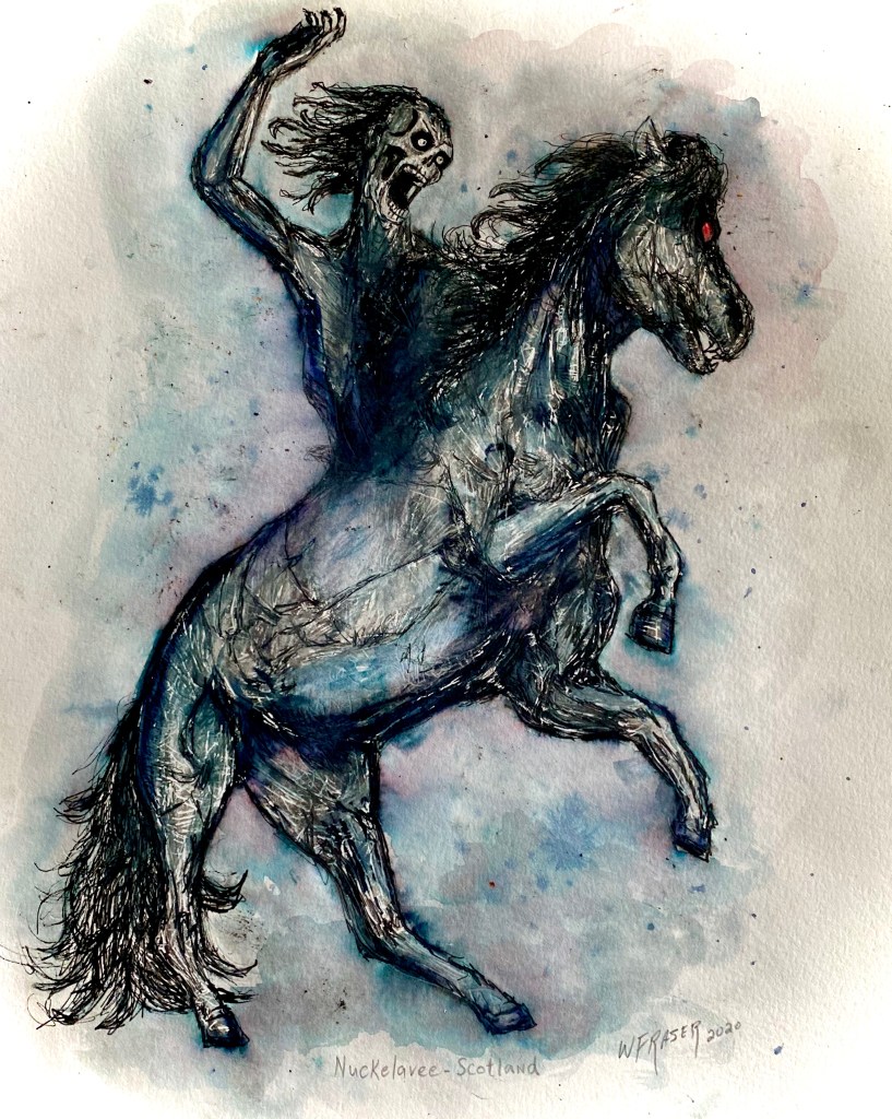 Looking like the flayed skinless remains of a giant man and a horse Frankensteined together, the Nuckelavee is a unique fairie monster shared by Celtic and Nordic mythology.Unique in that it is lacking in a duality of nature like most fae, it is driven only by its murderous hatred of humankind. Striding from the sea spewing poisonous fumes, the only known way to deter the Nuckelavee is pure water: Either rain driving it back into the depths of the sea or else crossing a stream to escape.